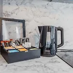 Along with tea and coffee making equipment, self-catering facilities in a fully furnished kitchen include a microwave oven, a refrigerator, and kitchenware.
